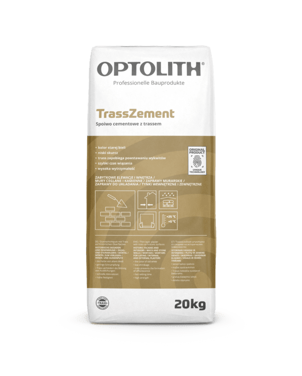 Optosan TrassZement  jest fabrycznie przygotowaną suchą mieszanką w kolorze naturalnej starej bieli, wiążącą hydraulicznie, przeznaczoną do przygotowania zapraw budowlanych bezpośrednio na placu budowy, po dodaniu odpowiedniego kruszywa. Optosan TrassZement  wyprodukowano z użyciem białego cementu portlandzkiego CEM 52,5 R zgodnego z PN-EN 197-1 oraz dodatku ok. 40% reńskiego trassu (naturalna pucolana).